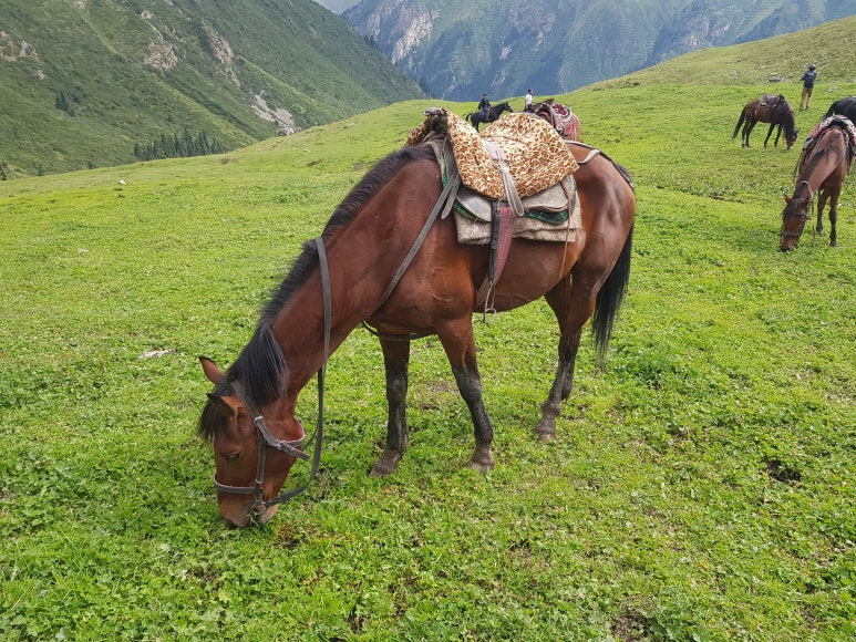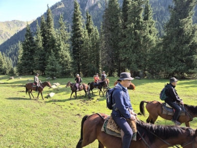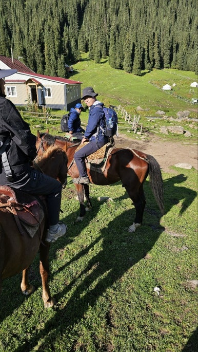 말을 타고 정상 도전 지점까지는 3시간 가야 한다. 거의 3,500m 지점이라고 들었다. 말은 앞 뒤로 이곳 마부들이 따라 다니며 안전 관리하고, 실제로는 각자 모는 거다. 송쿨에서 한 번 타본 적이 있으니 자신있게 승마. 말들은 힘이 넘치고 순하며 이곳 지리에 익숙해 말 타는데 별 문제 없다. 겁만 안먹으면 된다고 할 수 있다만 그것은 아니고 내려갈 때는 몸을 뒤로 졋혀야하고, 나무 바로 옆으로 가지 않도록 유도도 해야 하고, 어느 정도 운동신경도 필요하다.